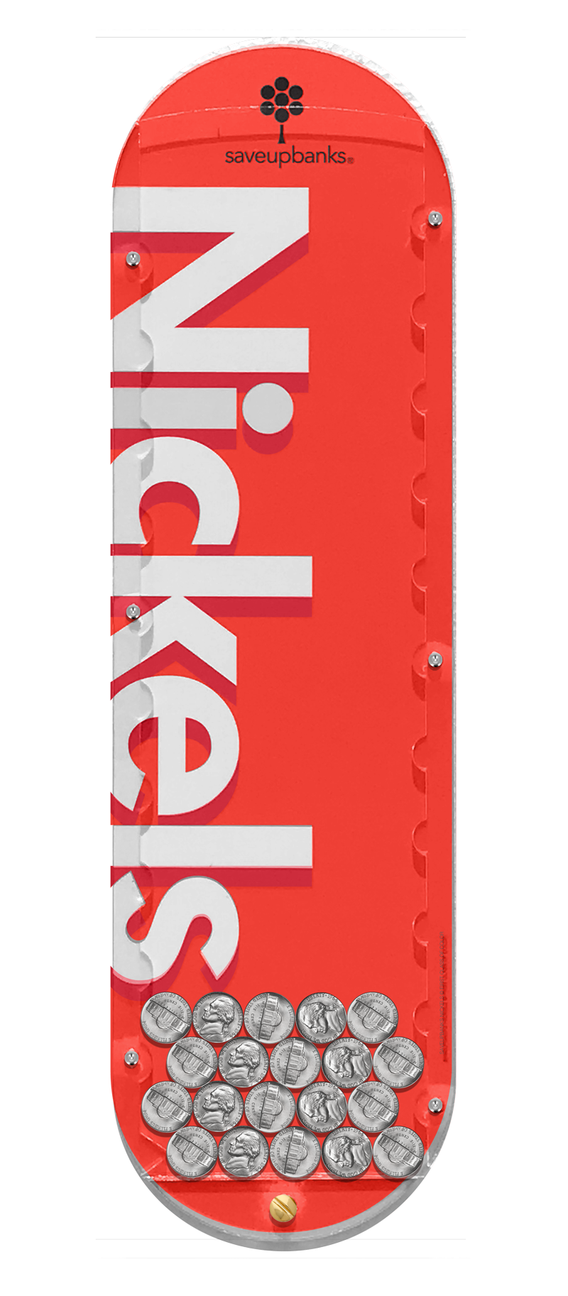 Nickel Coin Bank. Wall mountable, great gift idea. Nicely designed, red and white design. Nickels forms a stacking formation when saving making it easy to view and count. Collect the entire coin set and save.