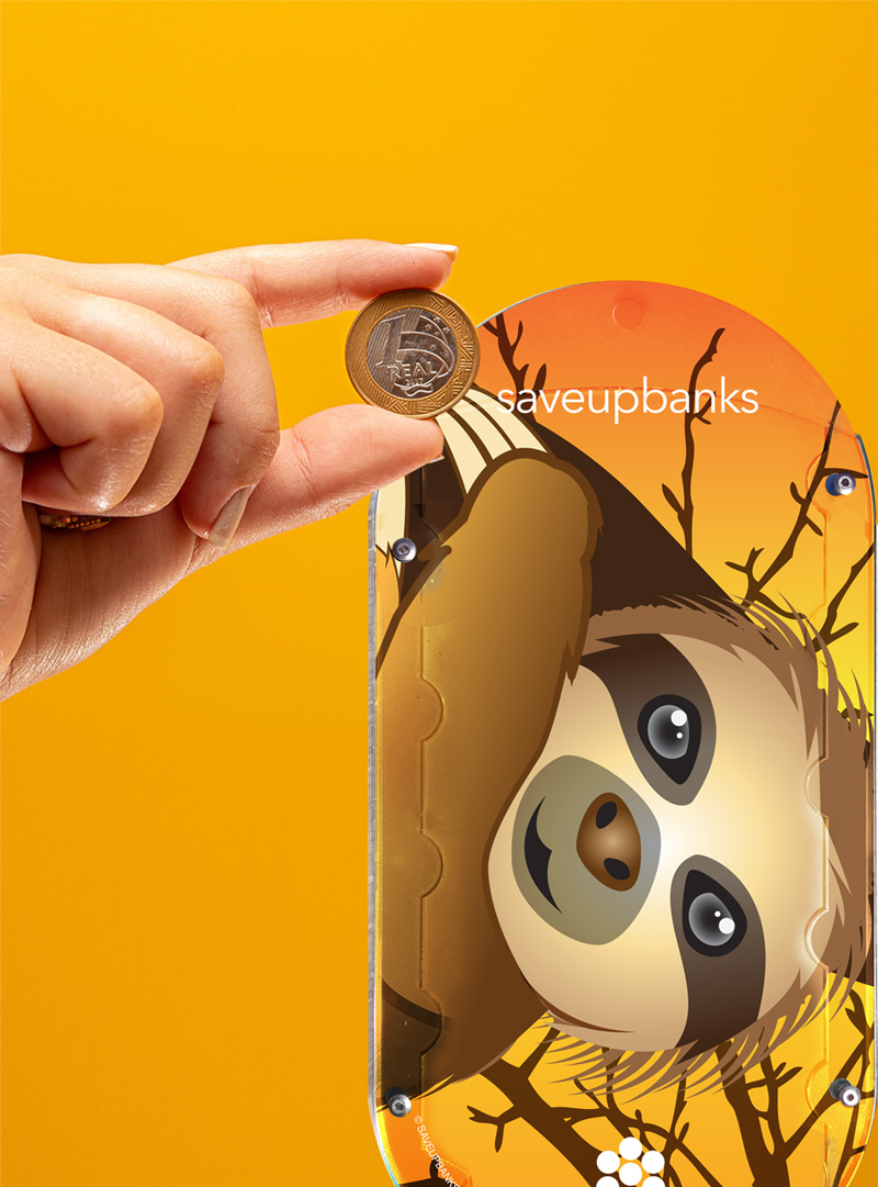Sloth coin Bank. Start saving by popping spare change into this adorable sloth coin bank, hand crafted in the USA with a clear plastic casing. The sloth is the world’s slowest mammal, so sedentary that algae grows on its furry coat. The plant gives it a greenish tint that is useful camouflage in the trees.